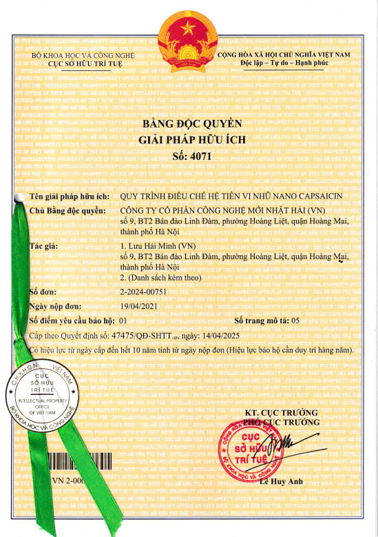 Công ty Cổ phần Công nghệ mới Nhật Hải (OIC NEW) tự hào là đơn vị tiên phong trong lĩnh vực nghiên cứu và phát triển các sản phẩm ứng dụng công nghệ nano. Ngày 14/04/2025, OIC NEW vinh dự được nhận thêm 2 bằng độc quyền sáng chế và GPHI được Cục Sở hữu Trí Tuệ cấp